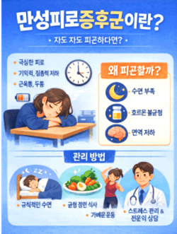 ✔ 핵심 요약자도 자도 피곤한 상태가 6개월 이상 지속되면 만성피로증후군 의심잠·휴식으로 회복되지 않는 피로가 가장 큰 특징자율신경·면역 이상·만성 스트레스가 주요 원인집중력 저하, 근육통, 두통이 함께 나타나는 경우 많음만성피로증후군 증상에 대해 알아보겠습니다. 자도 자도 피곤한 이유는 단순한 수면 부족이 아닐 수 있습니다.충분히 잤는데도 아침부터 이미 지쳐 있고, 며칠 쉬어도 회복되지 않는다면 그 피로는 몸이 보내는 구조적인 신호일 가능성이 큽니다.아산병원 만성피로증후군 증상 바로 확인하기1. 만성피로증후군이란?만성피로증후군(CFS)은 충분한 휴식에도 불구하고 6개월 이상 지속되는 극심한 피로로 인해 일상생활 기능이 현저히 떨어지는 상태를 말합니다.단순 과로나 스트레스와 달리, 잠을 자도 개운하지 않..