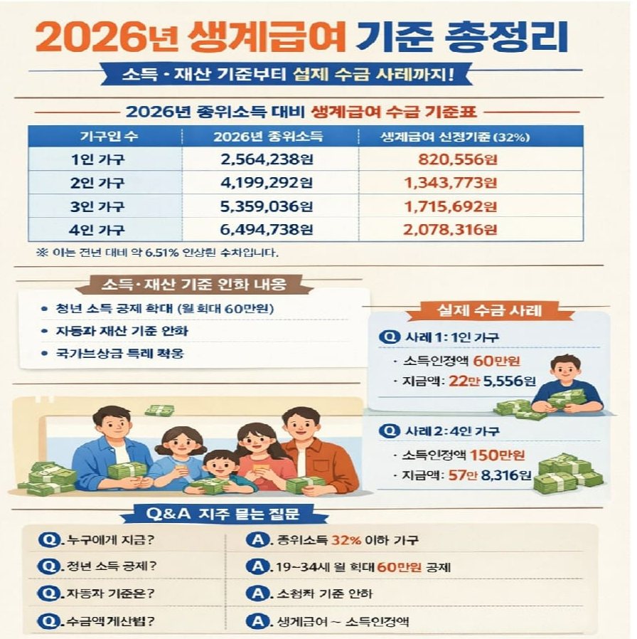 2026년 생계급여 선정 기준부터 필수 서류, 그리고 직접 겪은 상담 사례까지 알아보겠습니다. 2026년은 그 어느 때보다 서민 경제를 위한 복지 안전망이 두터워진 해입니다. 특히 기초생활보장제도의 핵심인 >'생계급여' 기준이 역대 최대로 상향되었다는 소식은 많은 분에게 큰 힘이 되고 있습니다. 물가 상승으로 인해 생활비 부담이 커진 지금, 정부는 선정 기준을 완화하고 지급액을 높여 더 많은 국민이 인간다운 삶을 영위할 수 있도록 정책을 개편했습니다.생계급여 계산기 바로가기 2026년 생계급여 핵심 요약선정 기준 상향: 기준 중위소득의 32%로 확정 (4인 가구 기준 월 최대 207만 원)소득 공제 확대: 만 34세 이하 청년 근로소득 60만 원 + 30% 공제 (일하는 청년 혜택 강화)재산 기준 완화..